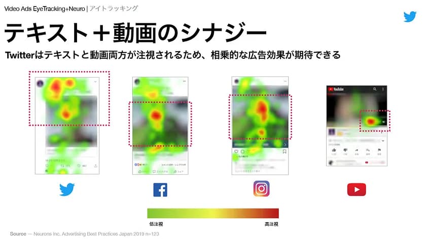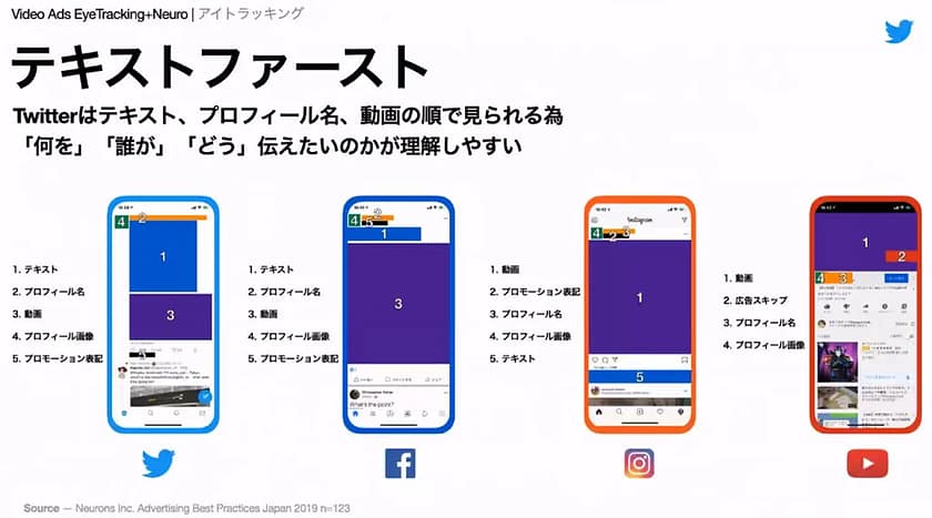 上記はアイトラッキングテストでユーザーが各エリアをどの順番で見ているかを表しています。InstagramやYouTubeでは画像/動画が最初に見られるのに対してXは最初にテキストが読まれる傾向が強いようです。