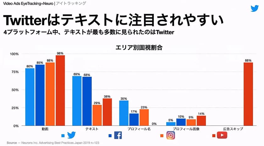 このテストによって、FacebookやInstagramでは主に動画を注視する傾向があるのに対して、Xはテキストと動画の両方が注視されているという結果が出ました。この結果のようにXでテキストがよく見られるのは、タイムライン上の構成の違いによるものだと考えられます。