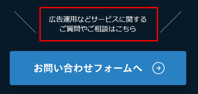 たとえば、画像の赤枠部分では「広告運用などサービスに関するご質問やご相談はこちら」という一文が添えられています。これは「お問い合わせフォームへ」というボタンの文言だけでは伝えきれない、具体的な利用シーンや目的を補足する役割を果たしています。