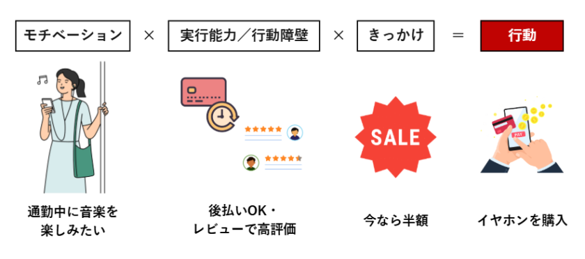 また、スタンフォード大学の行動科学者・B.J.フォッグ氏が提唱した『フォッグ式消費者行動モデル(FBM)』によれば、人が何かしらの行動を起こすには、「モチベーション」「実行能力/行動障壁」「きっかけ」の3つの要素が揃っている必要があるとされています。