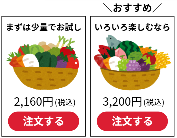 以下の食品ECの事例では、おすすめのプランを強調したり、「まずは少量でお試し」「いろいろ楽しむなら〇〇セット」など、プランごとの利用イメージをマイクロコピーで補足しています。