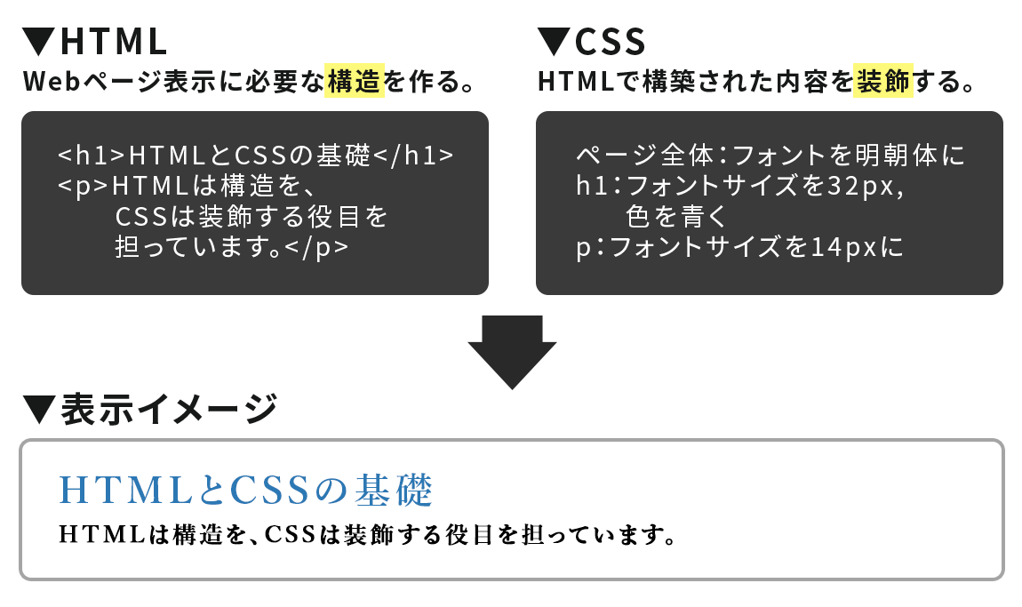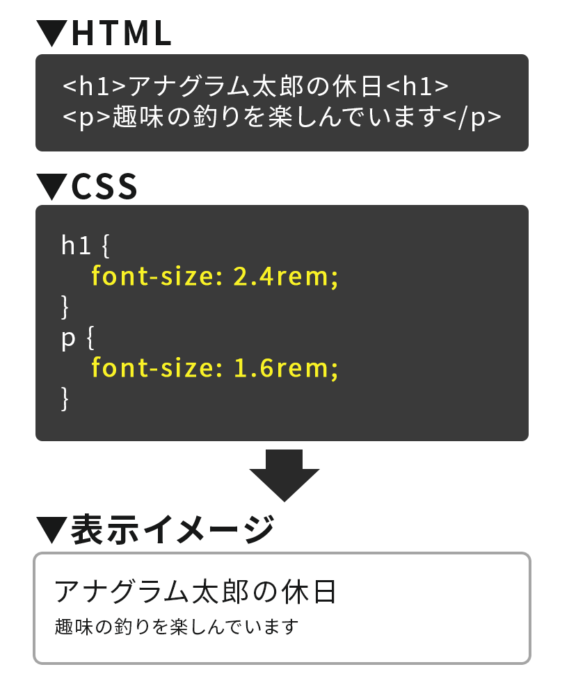 CSSでは、HTMLの説明で紹介した<h1>や<p>タグなどをセレクタとして指定し、その部分の文字の色やサイズなどを装飾できます。