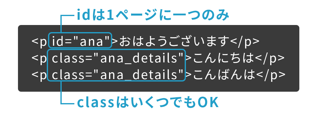 idは1ページ中に一つのみ、classはいくつでも同じ属性値を設定することが可能です。