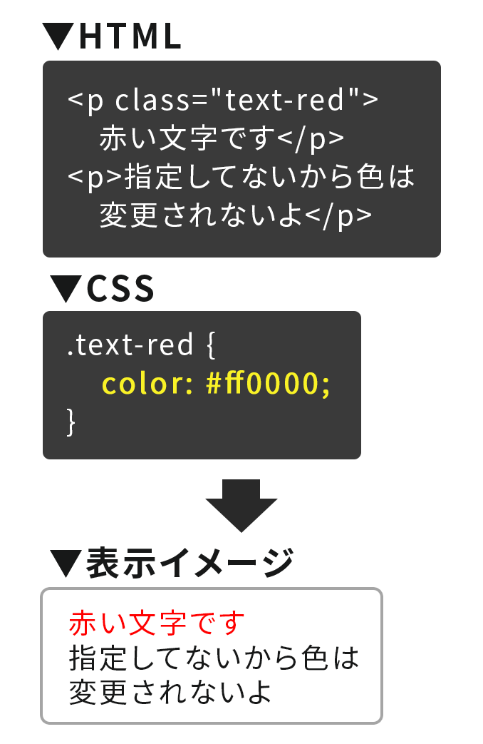 | class指定 | HTMLでclassをつけたclass名を使って指定する | .test { プロパティ: 値; }(class名の前にピリオド「.」をつける) |