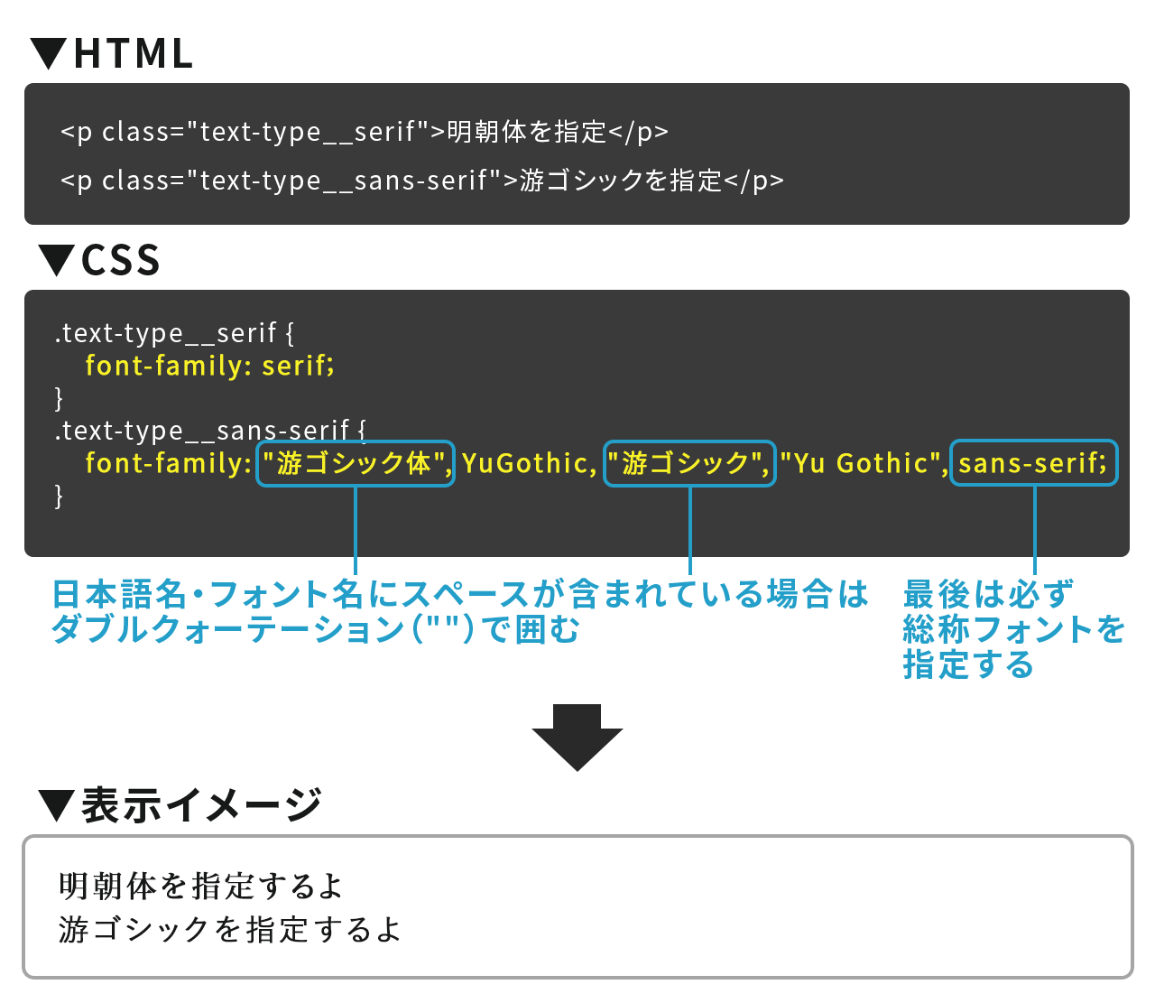 総称フォントを指定しないと、それより前に指定した個別フォント(游ゴシックなど)が読み込めなかった場合に、意図しないフォントで表示されてしまう可能性があるので、必ず入れるようにしましょう。