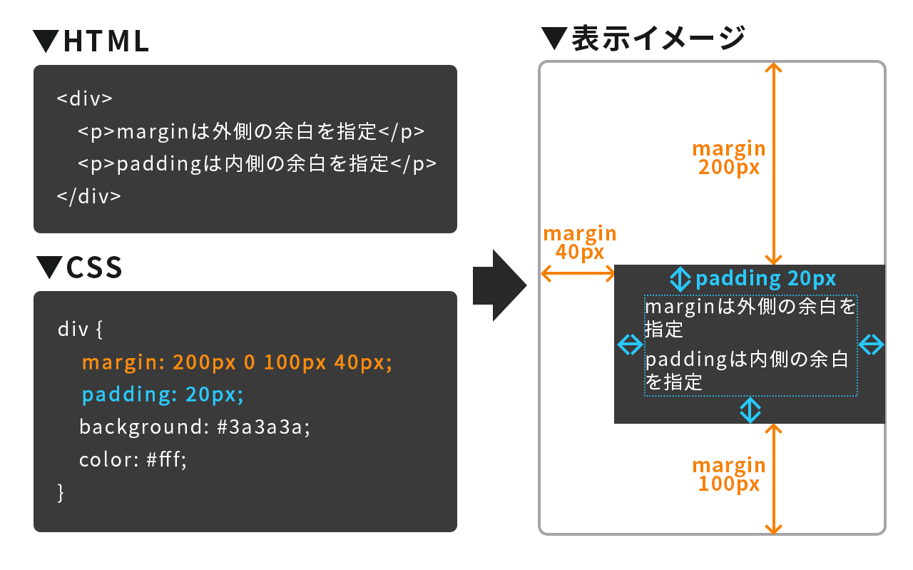 要素の外側の余白を指定するにはmarginを、内側の余白にはpaddingを指定します。