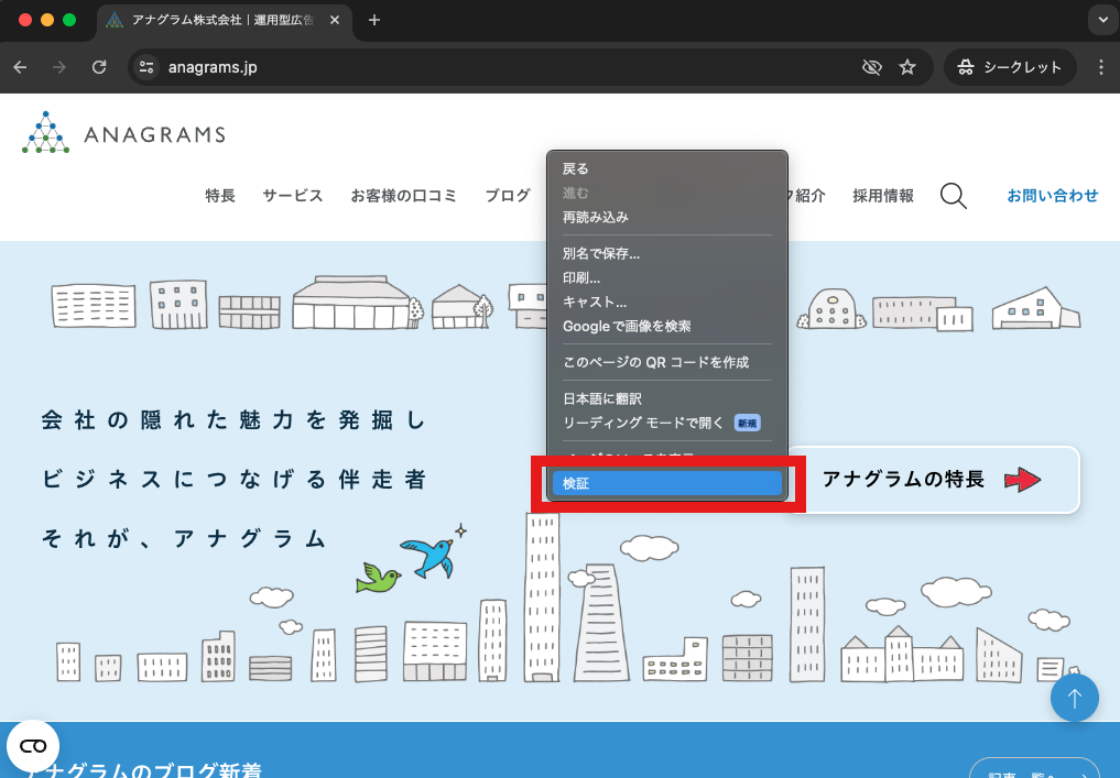 検証ツールは、Webページを右クリックし、メニューから「検証」をクリックして表示します。