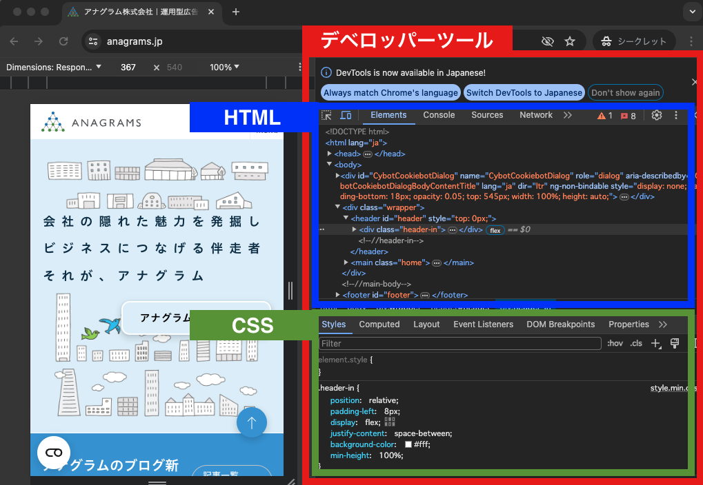 画面右側の表示がデベロッパーツールで、その中にHTMLとCSSが表示されます。