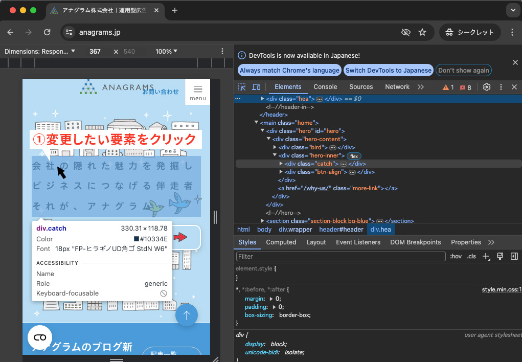 ②①でクリックした要素に該当するHTMLコードが選択されます。