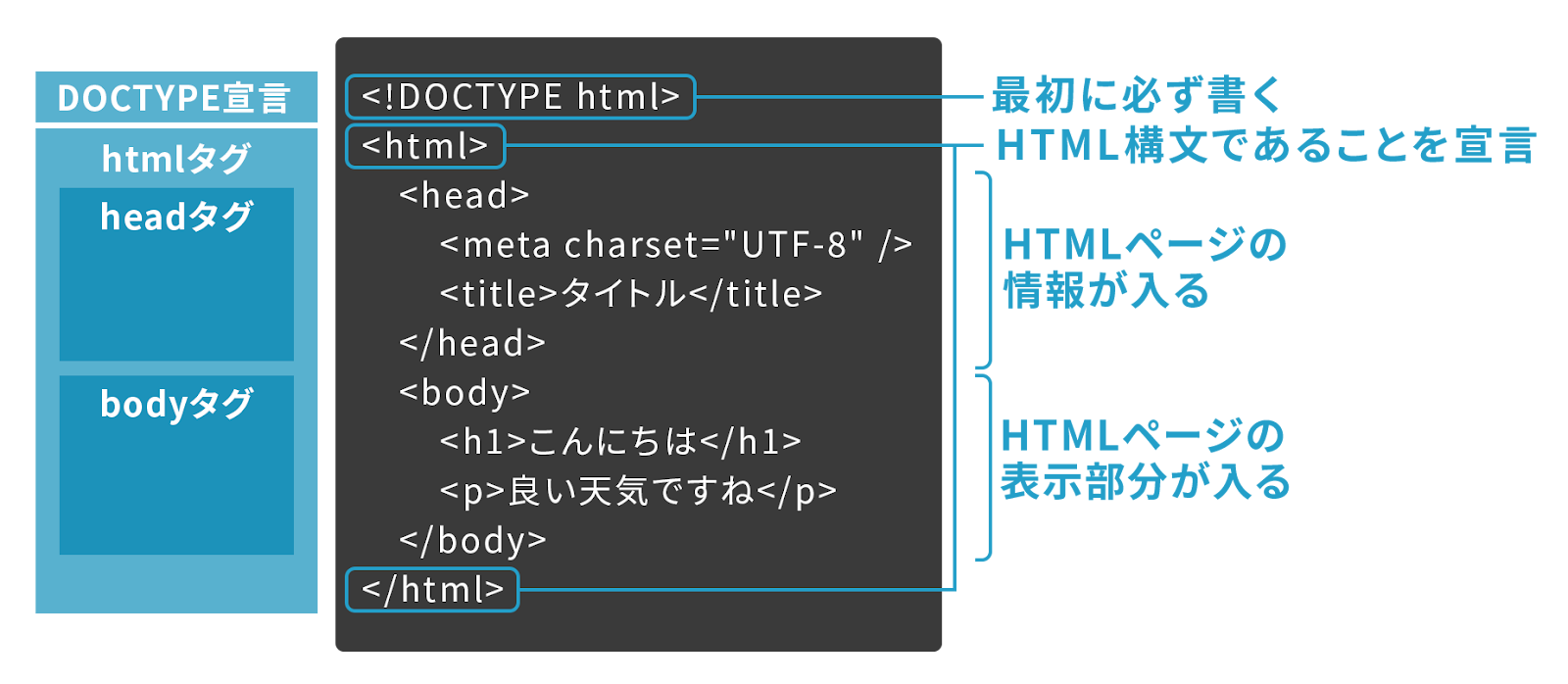 HTMLを構築するとき、必ず先頭に<!DOCTYPE html>と書き、その直下に<html>〜<html>を記載してください。こうすることで、HTMLファイルのバージョンをブラウザに宣言することができます。 書かなかった場合、一部のブラウザでは意図したとおりに表示されない可能性があります。