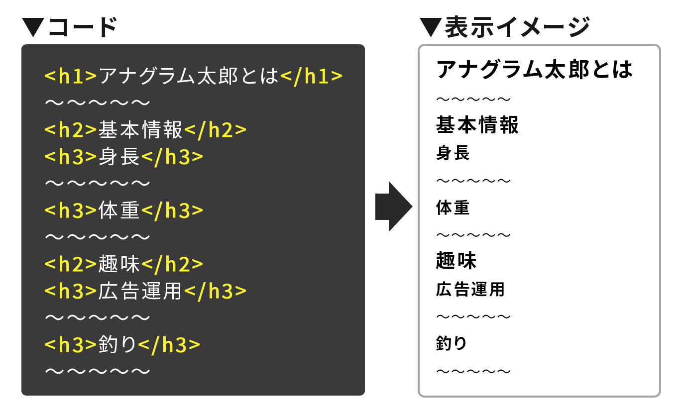 h1が一番大きく、数字が大きくなるほど小見出しになります。