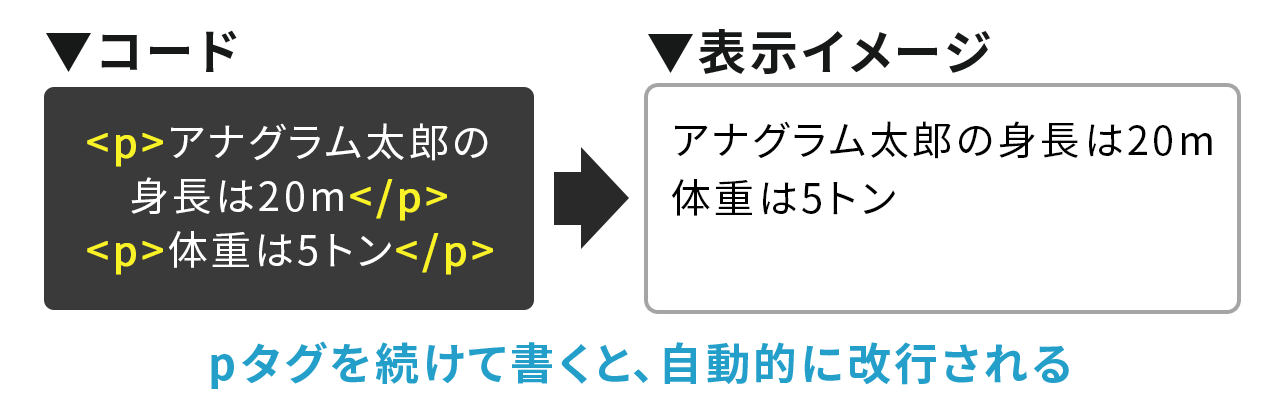 たとえば、「こんにちは」という文字を表示させたいときは、「<p>こんにちは</p>」のように、文字をpタグで囲んで書くことで、文字を表示させることができます。