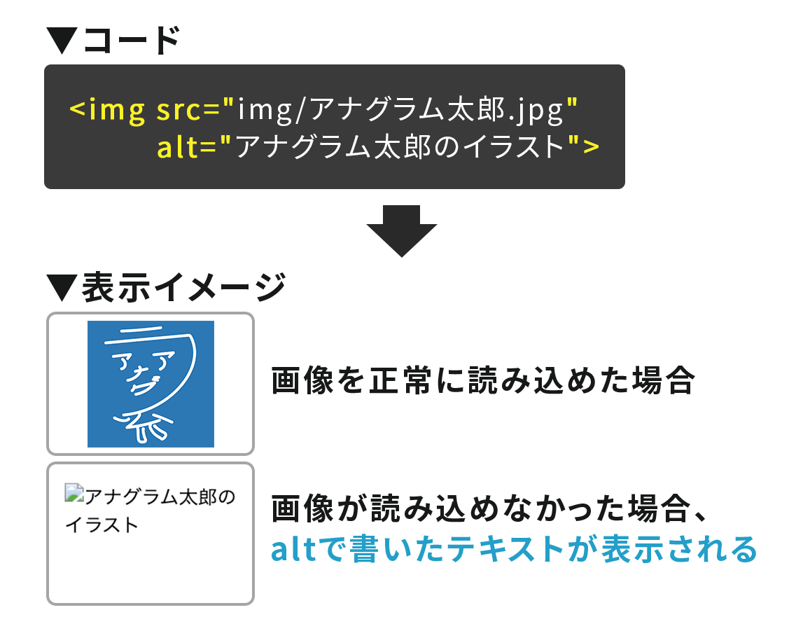 imgタグは他のタグのように終了タグ(例:</p>)がなく、src属性で画像のパスを指定し、alt属性は、ブラウザ上で画像が上手く表示されなかった際に表示したいテキストを指定します。二つの属性は必ず指定するようにしましょう。