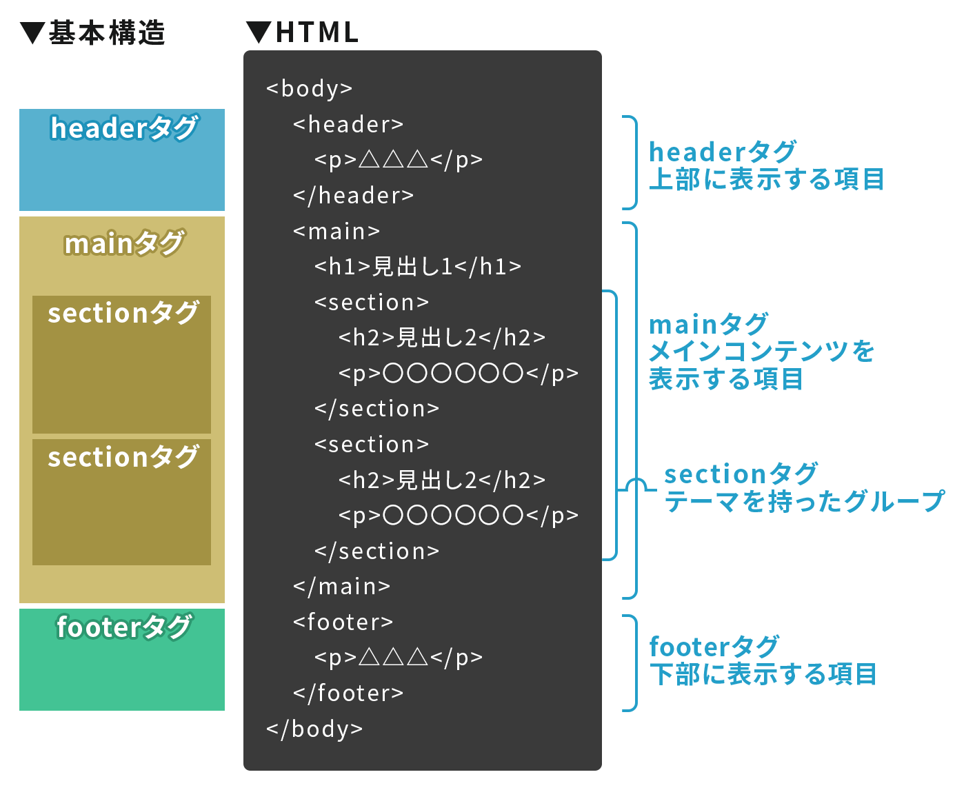 | mainタグ | ページのメインコンテンツ(一般的にheader, footer以外はこのタグに入れる) | <main>表示したい要素</main> |