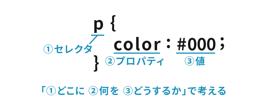 | 要素指定 | タグに対して指定する例:body, h1, p, a, | p { プロパティ: 値; } |