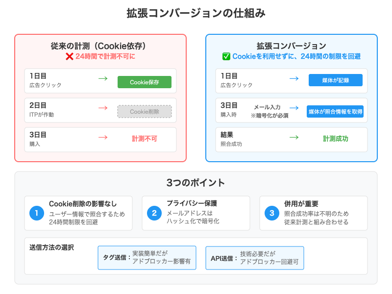 - 拡張コンバージョン: 実装が比較的容易でCookieに依存しない計測を実現。ただしマッチング率(40〜70%)に左右される