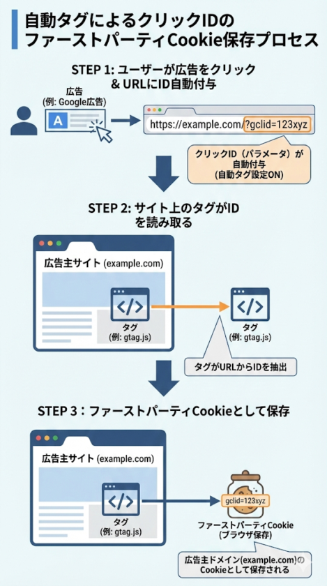 自動タグ設定をオンにすると、広告クリック時にURLへ「クリックID」がパラメータとして自動付与されます。この仕組みにより、クリックIDをファーストパーティCookieとして保存できるようになりました。