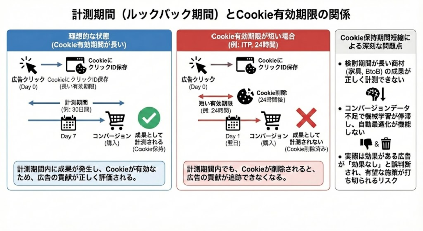 この計測期間は、Cookieの有効期限によって制限を受けます。コンバージョンを広告に紐づけるには、クリック時に発行されたクリックIDをCookieに保存しておく必要があるためです。Cookieが削除されると「どの広告経由だったか」が分からなくなり、成果として計測できません。