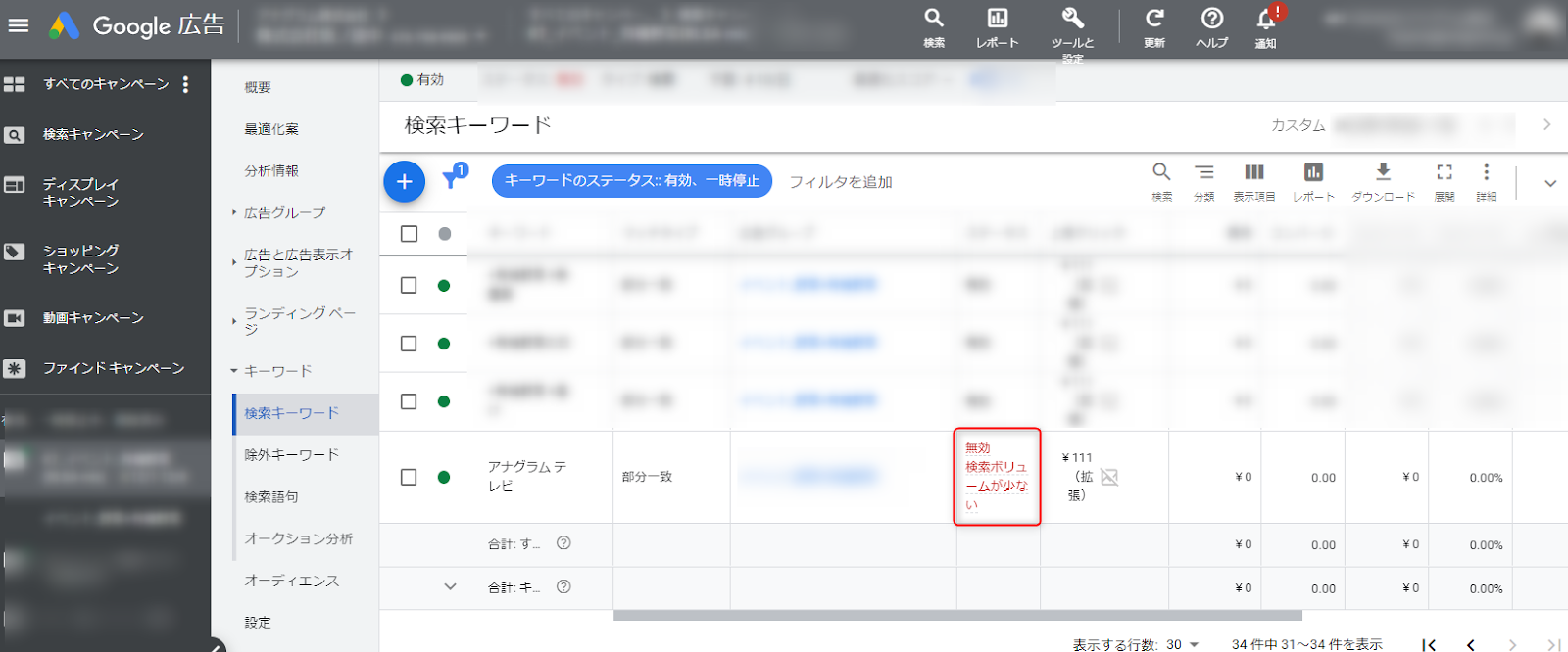 「検索ボリュームが少ない」と表示されるキーワードは、Google での検索トラフィックが極めて少なく、ユーザーによる検索のほとんどとあまり関連性がありません。このため、これらのキーワードで広告が表示されないよう、一時的に非アクティブにされます。