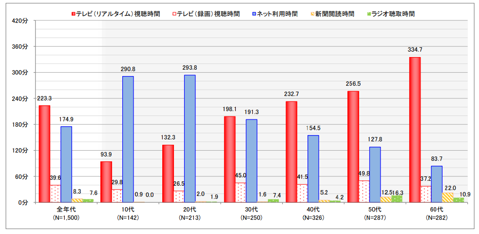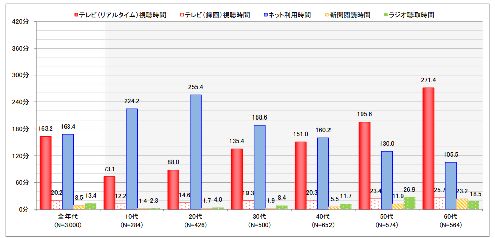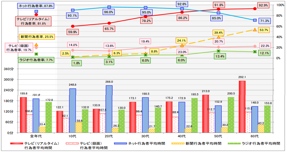 「令和2年度情報通信メディアの利用時間と情報行動に関する調査報告書」令和3年8月総務省情報通信政策研究所によると、10代・20代・30代は平日の行為者率(メディアを利用した人の比率)・行為者平均時間(メディアを利用した時間の平均)ともに、テレビ(リアルタイム)よりもネットの方が高くなっています。
