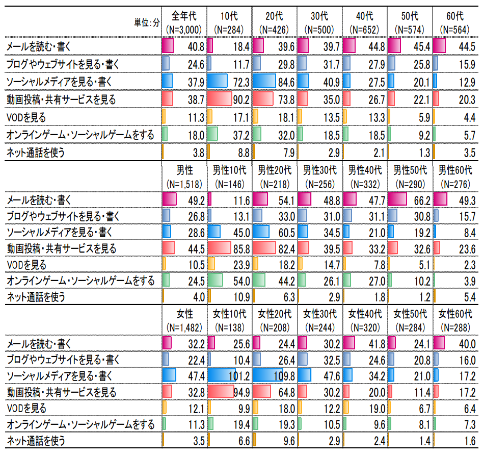 ネットのうち「動画投稿・共有サービスを見る」が男性だと全年代でトップの平均利用時間、女性だと「ソーシャルメディアを見る・書く」に次いでトップです。