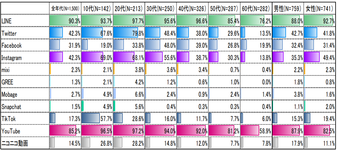 【令和2年度】主なソーシャルメディア系サービス/アプリ等の利用率(全年代・年代別)