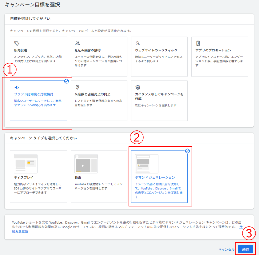 ①キャンペーン作成画面で、「ブランド認知度と比較検討」の目的を選択します。