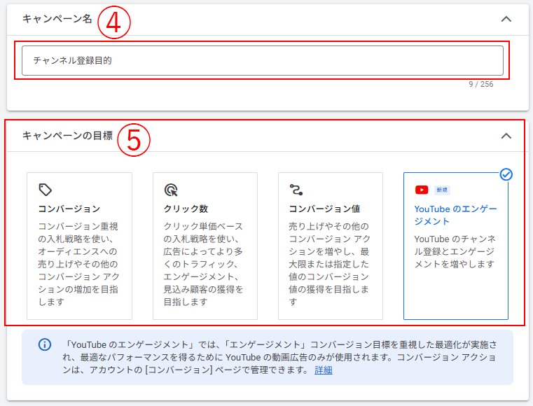 ⑤キャンペーンの目標として「YouTubeのエンゲージメント」を選択します。