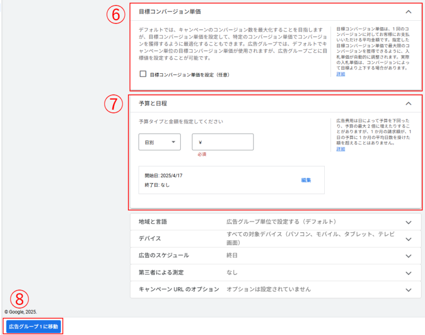 ⑥必要に応じて、目標コンバージョン単価を設定します。