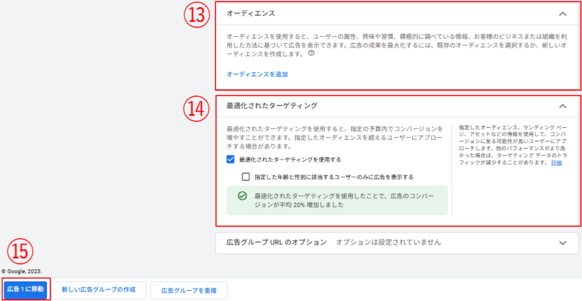 ⑮「広告1に移動」をクリックすると、広告の作成に入ります。