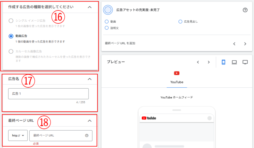 ⑯YouTubeでのエンゲージ目標のため、「動画広告」のみ選択できます。