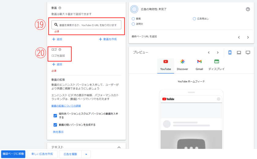 ⑲動画のタイトルで検索か、YouTubeのURLを入力して、広告配信したいYouTube動画を選択します。広告に使用できるのは、「公開」もしくは「限定公開」の動画のみです。ステータスが「非公開」の動画は広告利用できませんので、あらかじめ公開範囲の変更を行いましょう。