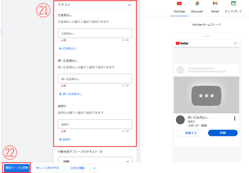 ㉑次は広告見出し、説明文などのテキストを入力します。