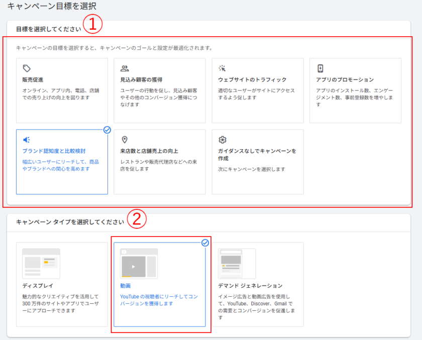 ※2025年7月以降、動画アクションキャンペーンはすべてデマンドジェネレーションキャンペーンにアップグレードされますので、特段理由がない場合は、デマンドジェネレーションキャンペーンでの作成をおすすめします。