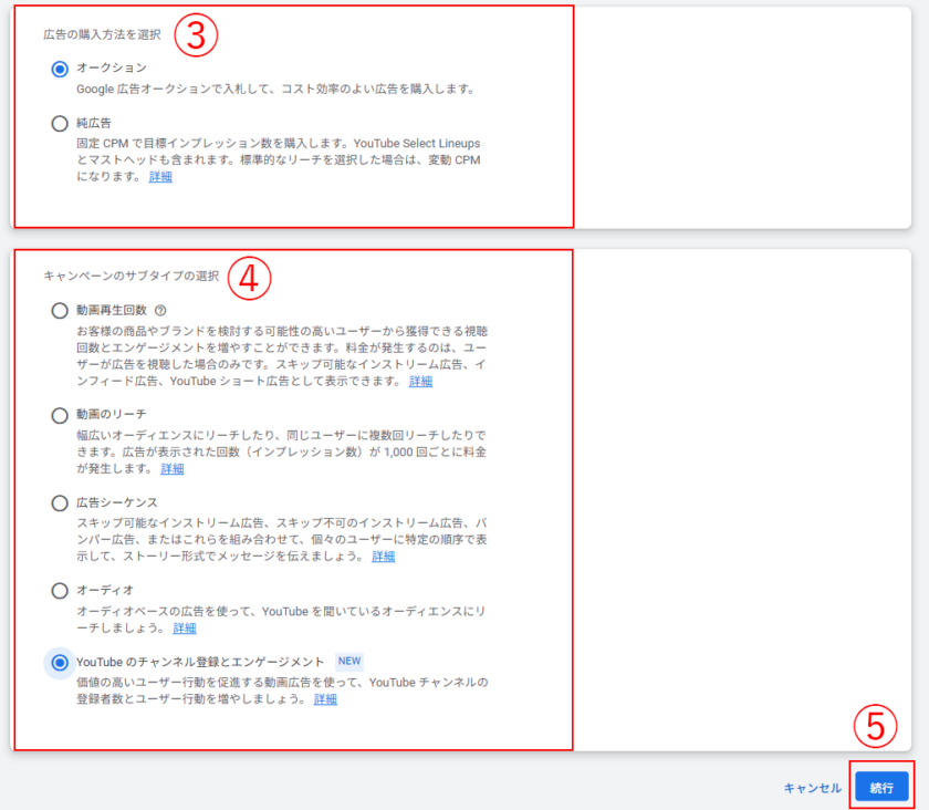 現在、YouTubeチャンネル登録を目的に広告を配信する場合、主に以下の2つのキャンペーンタイプが利用可能です。