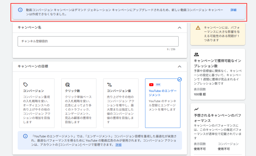 なお、2025年4月時点では、すでにYouTube広告での動画アクションキャンペーン(VAC)の作成は、強制的にデマンドジェネレーションキャンペーンへ移行するアカウントも見受けられます。