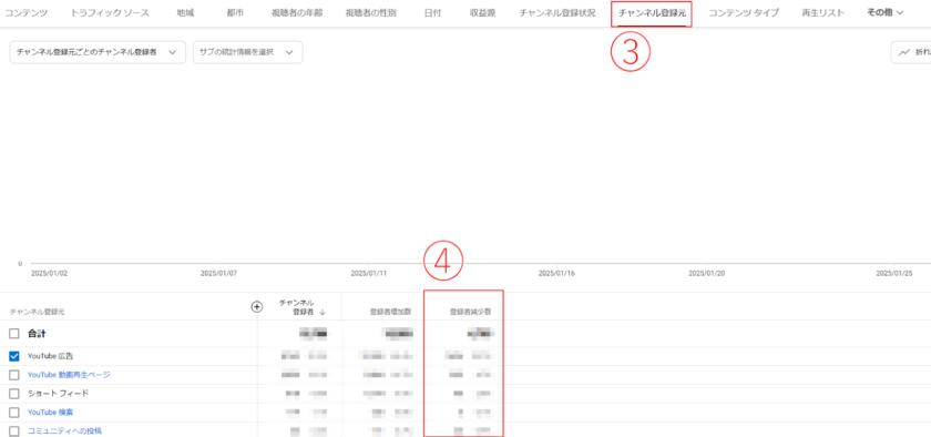 YouTube Studioでは、チャンネル登録者の増減を流入元別に確認できます。