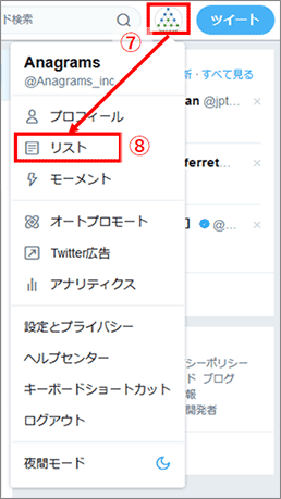 追加したリストは、⑦画面右上の自分のアイコンをクリックすることで表示される⑧「リスト」から確認できます。