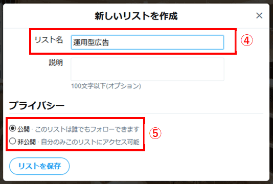 ④で適切なリスト名を入力し、⑤リストが第三者からも見えるようにするか否かのオプションを設定したらリストを保存します。
