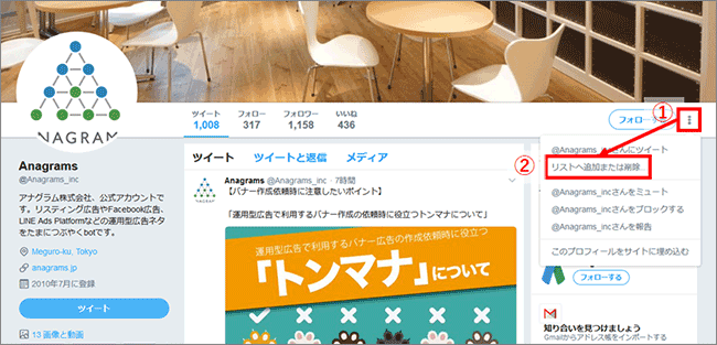 リストに追加したいアカウントのページを表示したら、①「︙」をクリックして②「リストへの追加と削除」をクリックします。