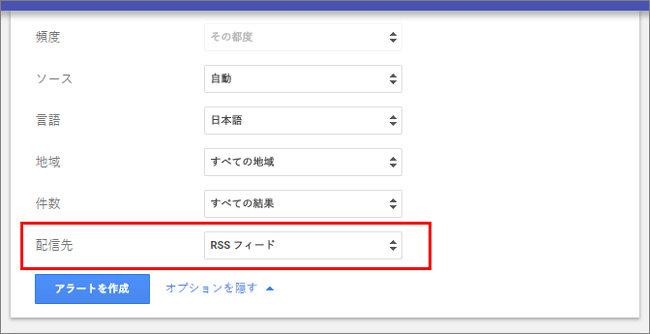 ここで注目すべきは「配信先」です。メール以外にもRSSフィードによる配信も可能ですので、さきほどご紹介したFeedlyにてチェックをすることもできるのです。