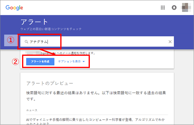 使い方は簡単で、Googleアラートのページアクセス、①新着通知を受け取りたいコンテンツに関するキーワードをし、②「アラートを作成」をクリックするだけ(Googleアカウントを持っていない場合は、加えて通知先メールアドレスを入力)です。