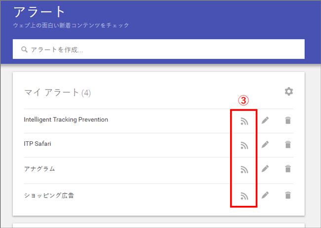 Feedlyに登録するのに必要なRSSフィードのURLは③のアイコンを右クリック、「リンクのアドレスをコピー」などをすることで取得可能です。設定したアラートごとにRSSフィードのURLは異なるので注意が必要です。