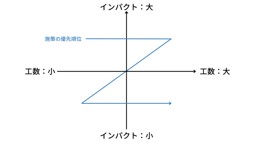 例えば、施策の優先順位を「工数(少〜多)」と「インパクト(小~大)」の掛け合わせで決めるというフレームワークを設けたとします。