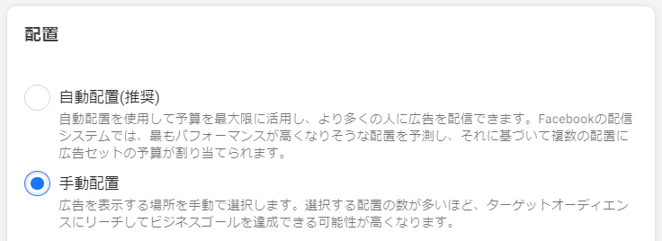 新たにリール広告配信用に広告セットを作成。配置にて手動配置を選択。