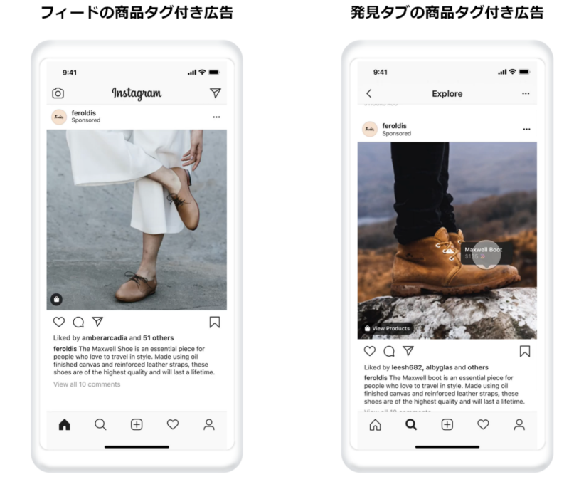 商品タグ付き広告(Instagramショッピング広告)とは、オーガニックのInstagramショッピング投稿同様、広告内の購入可能な(ショッパブルな)商品の画像や動画に、商品の説明、価格、商品を購入できるウェブサイトに誘導するリンクなどの情報をタグ付けすることで、商品に興味を持ったユーザーを商品詳細ページへと誘導できる広告です。
