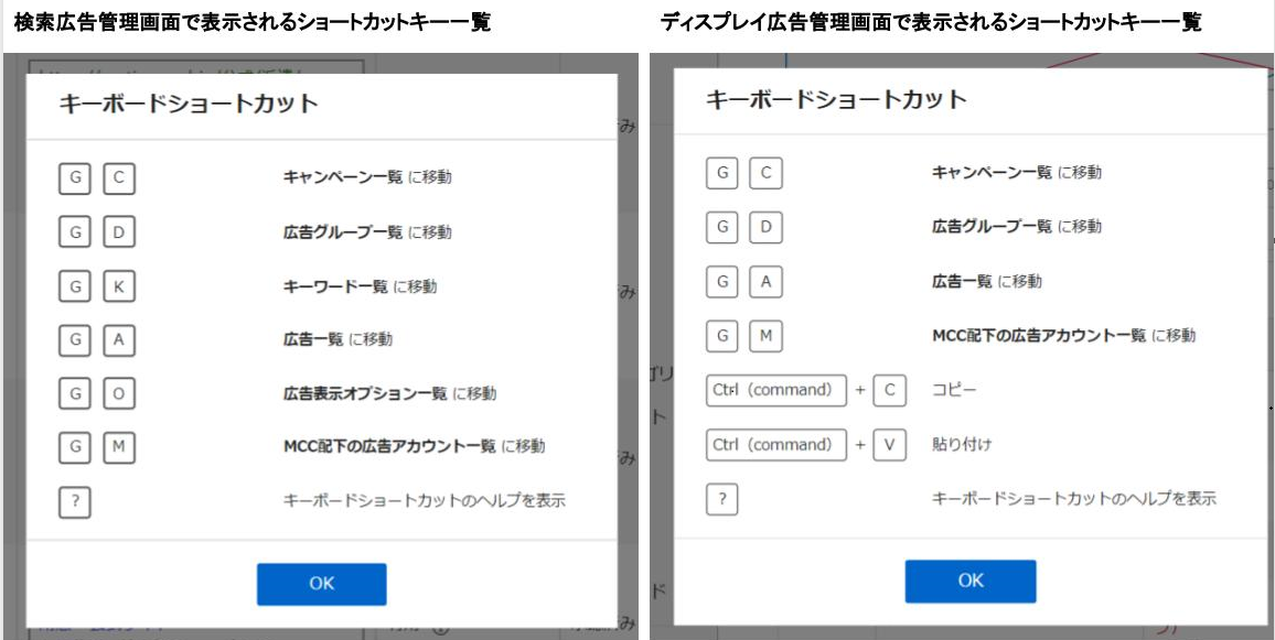 広告管理画面では、ショートカットキーの一覧を表示するショートカットキーが用意されています。検索広告、ディスプレイ広告ともに、「Shift+?」でショートカットキーの一覧を表示できます。
