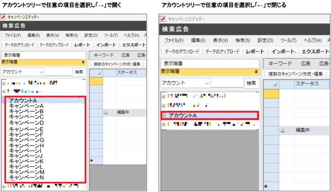 アカウントツリー内でアカウントやキャンペーンの開閉ができます。