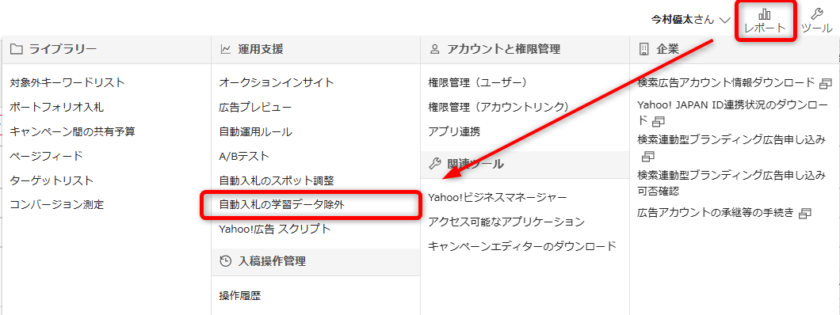 Yahoo!検索広告にログイン後、右上の「ツール」から「自動入札の学習データ除外」を選択。