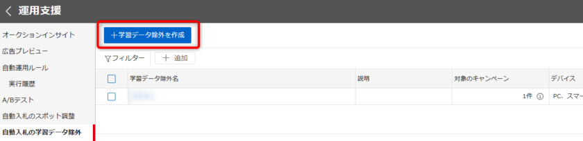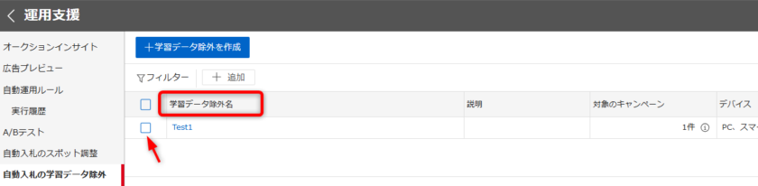 作成した「自動入札の学習データ除外」は一覧に表示されます。該当の学習データ除外名をクリックすると編集ができ、チェックを入れて「学習データ除外を削除」で削除も可能です。